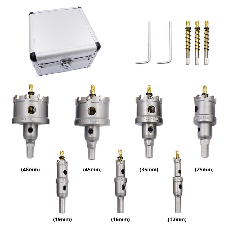 - ⭐LAIWEI Hole Saw kit includes 7 hole saws: 1/2"(12mm),5/8"(16mm hole saw), 3/4 (19mm hole saw), 1-1/8"(29mm hole saw), 1-3/8(35mm hole saw), 1-25/32"(45mm hole saw), 1-7/8"(48mm hole saw),to meet the needs of different situations, 3 x spare pilot drills for replacement, 2 x wrenches. 1 aluminium carrying case.