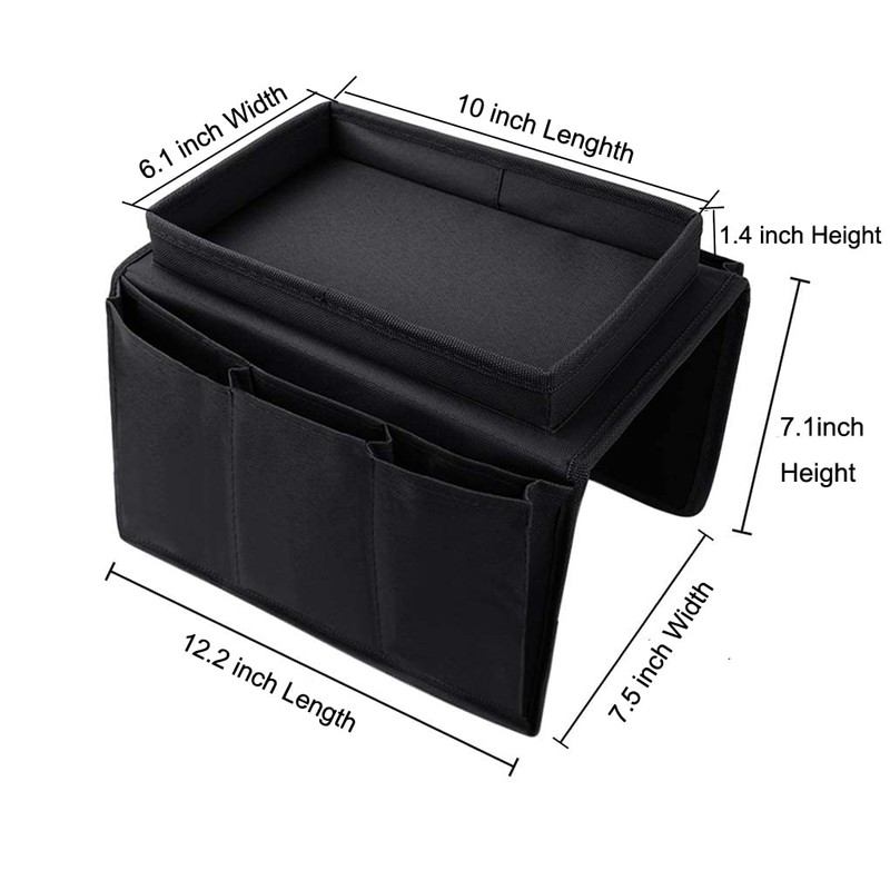 - Total Size: 12.2*7.5*7.1 inch (L*W*H), Tray Size: 10*6.1*1.4 inch (L*W*H). The remote organizer caddy fits for most couch, recliner, sofa and chair arms; With this armrest pouch hanging at your sofa, all you've gotta do is reach to your side and take whatever needed from the couch caddy organizer right next to you
