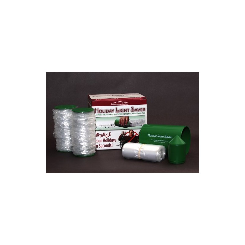 - Each kit includes the Holiday Light Saver (on right)with 2 pre -loaded cartridges (on left), 120 feet of additional bagging (on right front), and a re-loading cone (far right front) to re-use your bags.