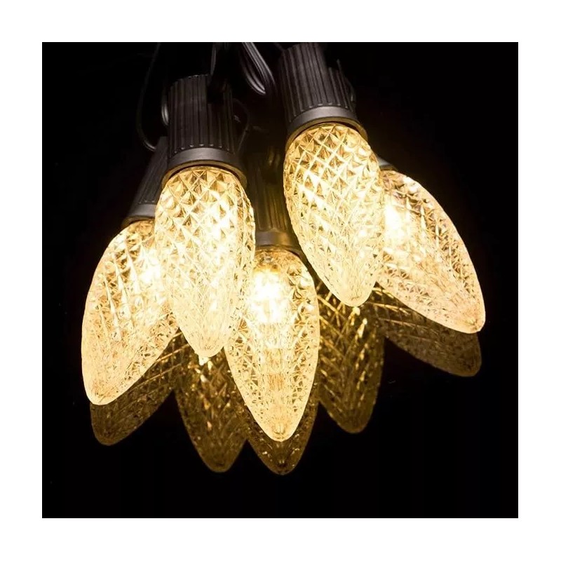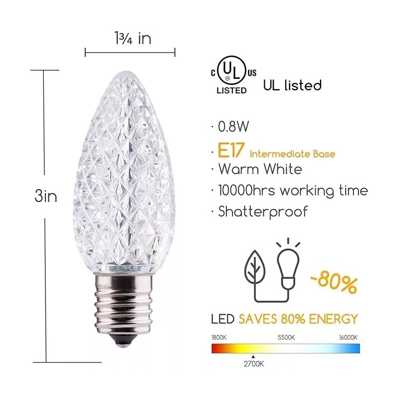 Upgrade your lighting with this 25 pack of dimmable warm white C9 LED replacement bulbs. These bulbs feature a faceted design and are suitable for both indoor and outdoor use. The warm white color temperature provides a cozy and inviting atmosphere to any room.