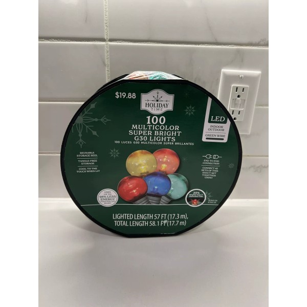 This is a Holiday Time 58.1 FT 100 Multicolor LED Super Bright G30 Christmas String Lights. The string lights feature warm white light color in globe shape, with 100 LED lights in multicolor. They are suitable for both indoor and outdoor use, powered by a cord. The lights are energy efficient with a 5-star Energy Star rating, perfect for Christmas and all occasions.