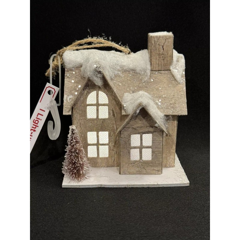Holiday Time Light-Up LED Christmas Ornament Neutral Putz Style Paper House w/ Sisal Tree NEW
