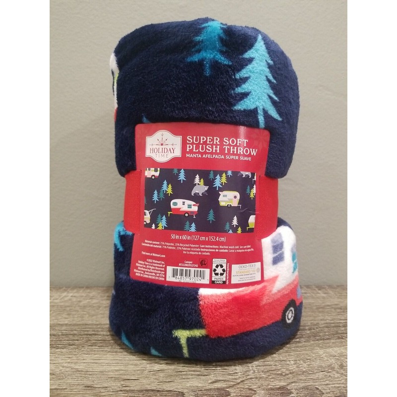 Holiday Time NEW SUPER SOFT COZY PLUSH THROW BLANKET 50" X 60" CAMPER WITH BEARS & TREES BLUE