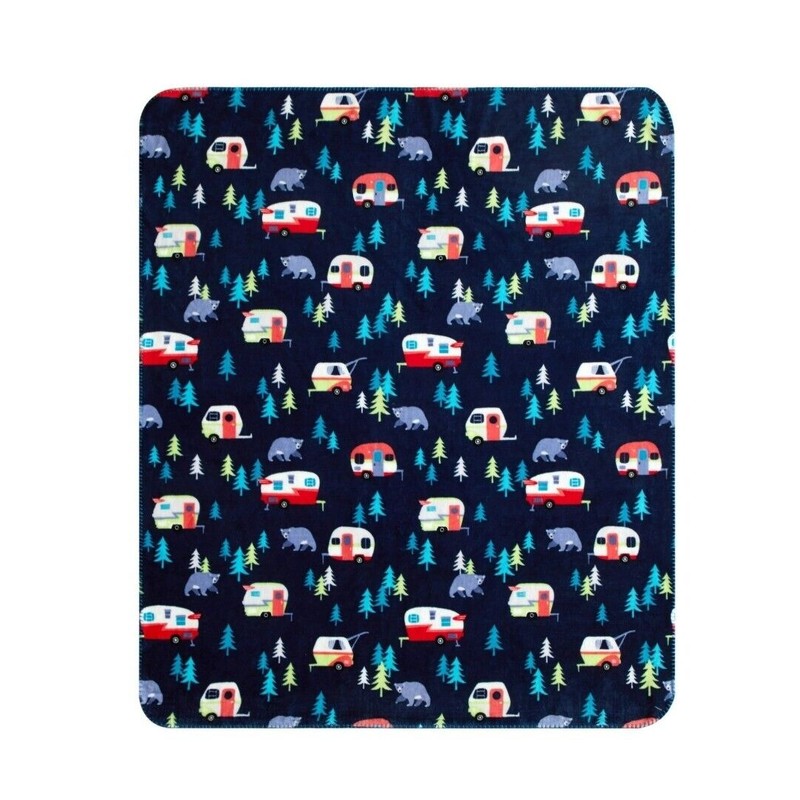 NEW SUPER SOFT COZY PLUSH THROW BLANKET 50" X 60" DARK BLUE WITH CAMPERS, BEARS & TRESS