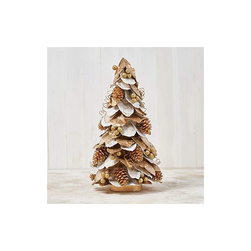 - ADD ELEGANCE TO ANY SPECIAL OCCASION – Holiday Tree Christmas Tabletop Tree - 24" Ivory Natural Gold Silver Jackfruit Leaves Cone tree, Handcrafted, Silvery and Gold preserved jackfruit leaves w/ glittery pinecones combine with golden berrie