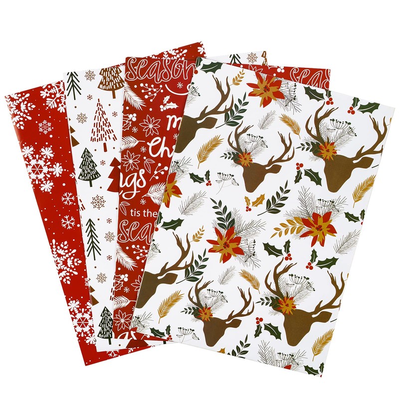 - CHRISTMAS DESIGN: White snowflakes feathers and "Merry Christmas"letterring are printed on red paper. Golden elk design, golden, green and red Christmas tree pattern on white paper