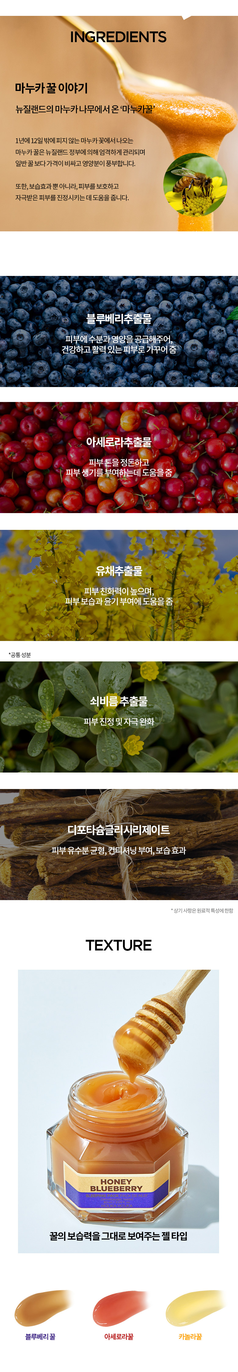 - All ingredients: Blueberry honey purified water, glycerin, dimethicone, butylene glycol, 1,2-hexanediol, glycereth-26, honey extract, raw sweet blueberry extract, arginine, hydrogenated castor oil isostearate, Carbomer, hydrogenated lecithin, acrylate/C10-30 alkyl acrylate crosspolymer, PEG-2M, sucrose distearate, dipotassium glycyrrhizate, purslane extract, sodium polyacrylate, disodium EDTA , caramel, yellow No. 5, red No. 227, ethylhexylglycerin, fragrance acerola honey purified water, glycerin, dimethicone, butylene glycol, 1,2-hexanediol, glycerol-26, honey extract, acerola extract, Arginine, carbomer, acrylate/C10-30 alkyl acrylate crosspolymer, PEG-2M, hydrogenated lecithin, sucrose distearate, dipotassium glycyrrhizate, purslane extract, sodium polyacrylate, ethylhexyl Glycerin, Disodium EDTA, Caramel, Yellow No. 4, Red No. 227, Fragrance Canola Honey Purified Water, Glycerin, Dimethicone, Butylene Glycol, 1,2-hexanediol, Glycereth-26, Honey Extract, Rape extract, arginine, carbomer, acrylate/C10-30 alkyl acrylate crosspolymer, PEG-2M, hydrogenated lecithin, sucrose distearate, dipotassium glycyrrhizate, purslane extract, sodium polyacrylate , Ethylhexylglycerin, Disodium EDTA, Yellow No. 4, Yellow No. 5, fragrance, limonene