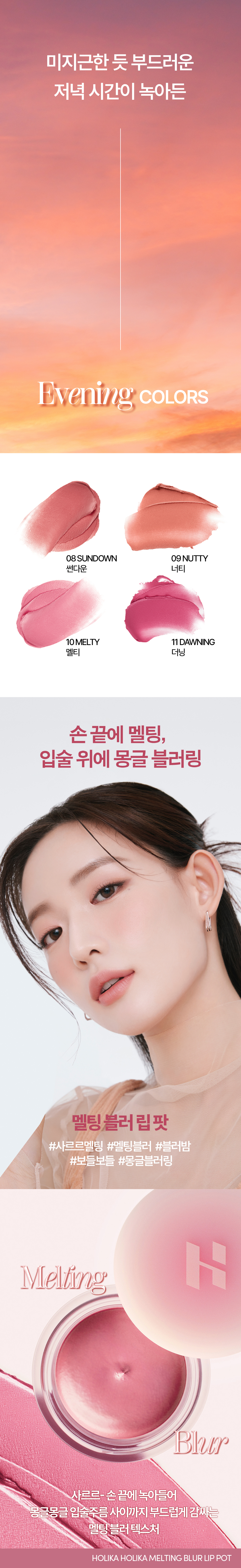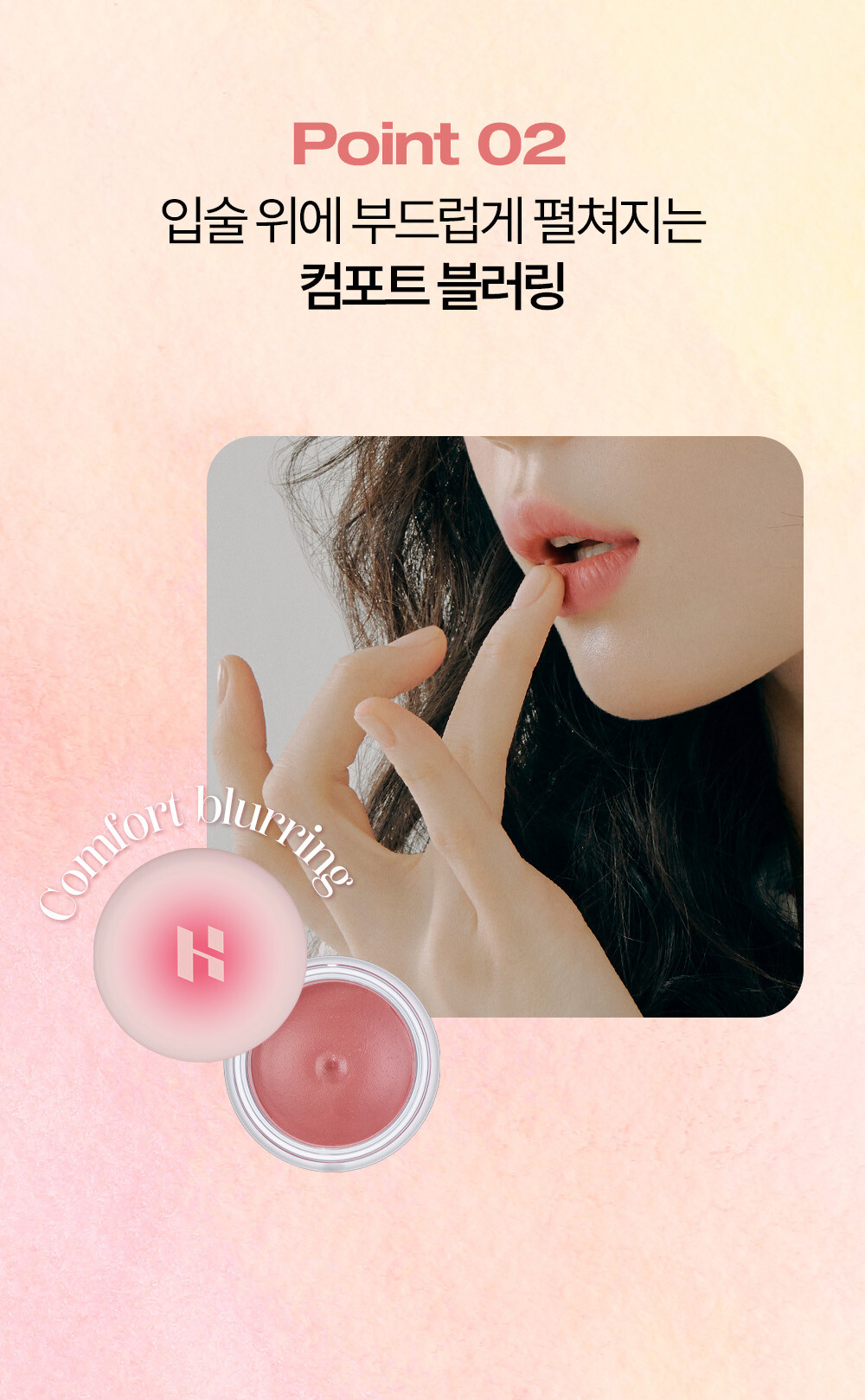 Provides a melting sensation on the fingertips and a creamy blurring effect on the lips. Melts smoothly on the fingertips and wraps smoothly between the wrinkles of the lips. Provides a soft, comfortable spreading blurring effect on the lips. Lightly wraps the lips with a fresh blurring effect without stickiness.