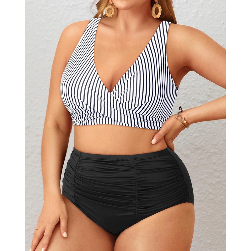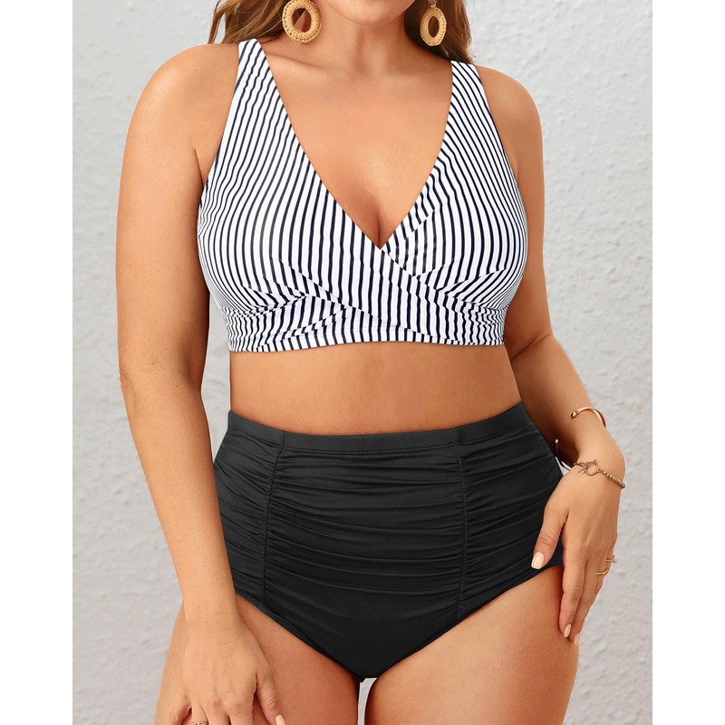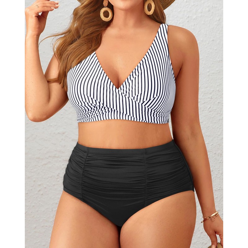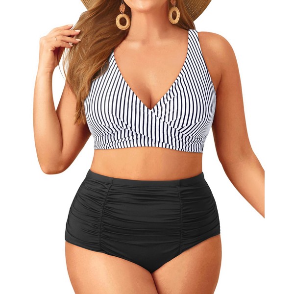 Holipick Two Piece Plus Size Swimsuits for Women High Waisted Bikini Tummy Control Bathing Suits Twist Front Swimwear Black Stripe