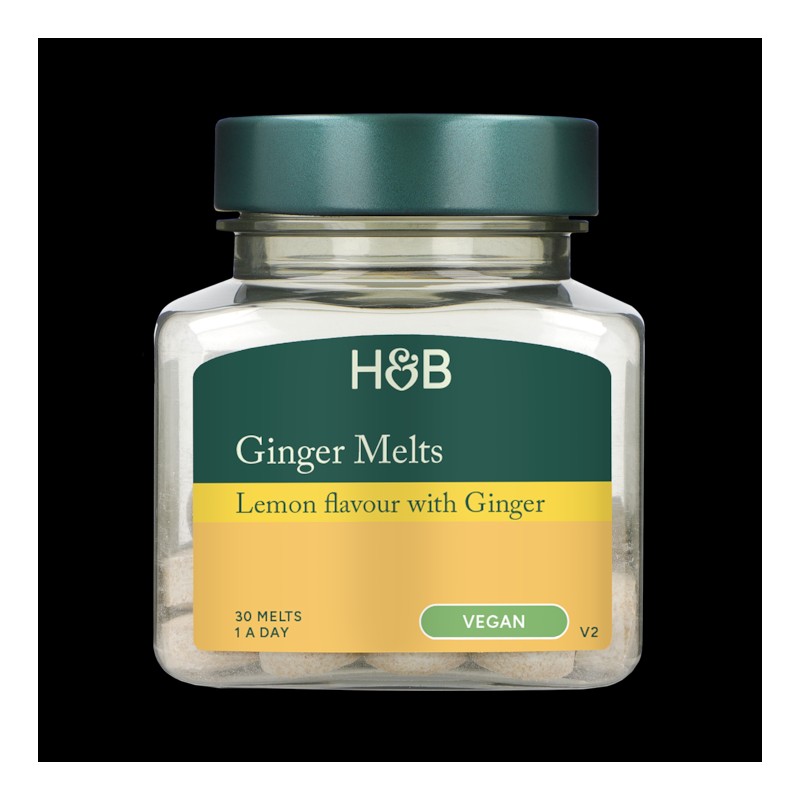 Holland & Barrett Ginger melts are a zesty lemon flavour with ginger. Per serving they contain 30mg ginger root extract (20:1 extract, equivalent to 600mg ginger root), plus vitamins B6 and B12 and vitamin C.