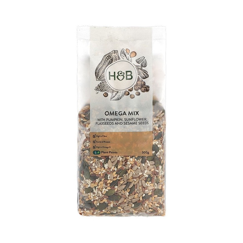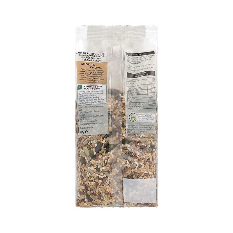 Holland & Barrett Omega Mix contains Pumpkin, Sunflower, Linseeds and Sesame seeds. Our Omega mix contains essential fatty acid Omega 3.