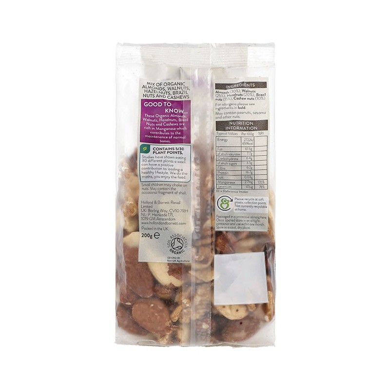 Holland & Barrett Organic Mixed Nuts contain organic almonds, walnuts, hazelnuts, Brazil nuts and cashews – all rich in manganese.