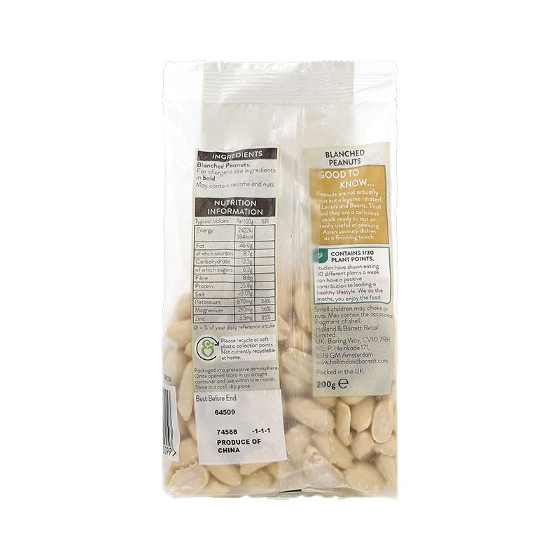 Holland & Barrett Jumbo Blanched Peanuts offer an excellent source of protein and they're high in fibre, zinc, magnesium, and potassium. Ideal for snacking and baking, these jumbo peanuts have been blanched to remove the skin.