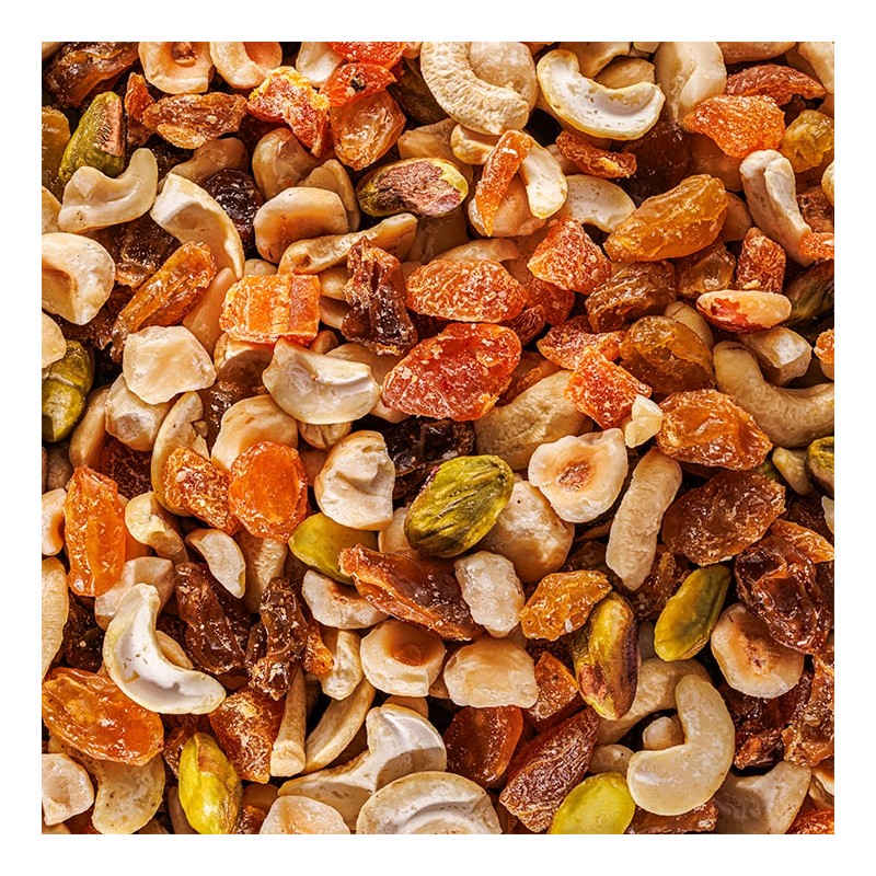 Dried Diced Apricots (23%) (Apricots, Rice flour, Preservative: Sulphur Dioxide), Cashew Nuts (23%), Golden Raisins (23%) (Raisins, Sunflower Oil, Preservative: Sulphur Dioxide), Toasted Hazelnut Halves (19%), Pistachio Nuts (9%).