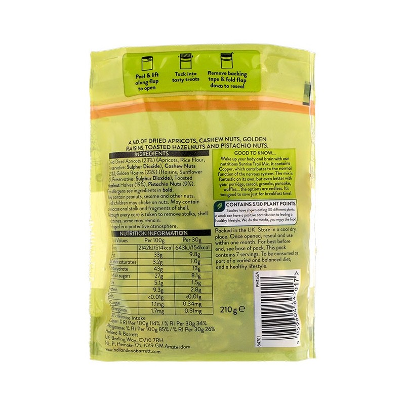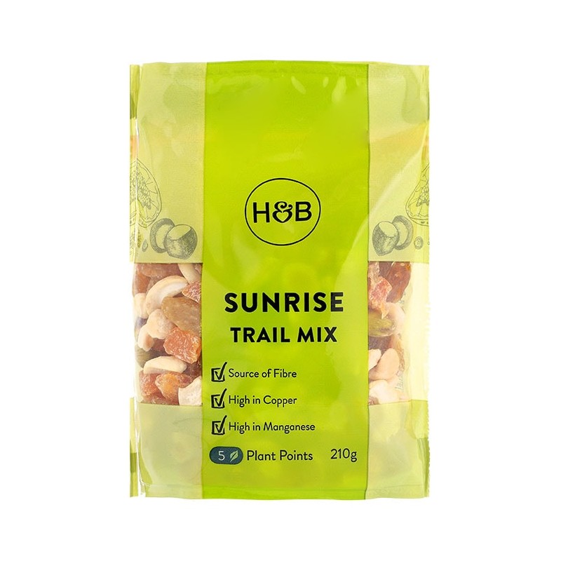 Including chunks of tender dried apricot. sweet and juicy golden raisins, alongside moreish cashews, pistachios and toasted hazelnuts – sunrise trail mix is packed with nutrients. High in trace minerals copper and manganese, as well as providing a source of fibre, sunrise trail mix is a nourishing choice.
