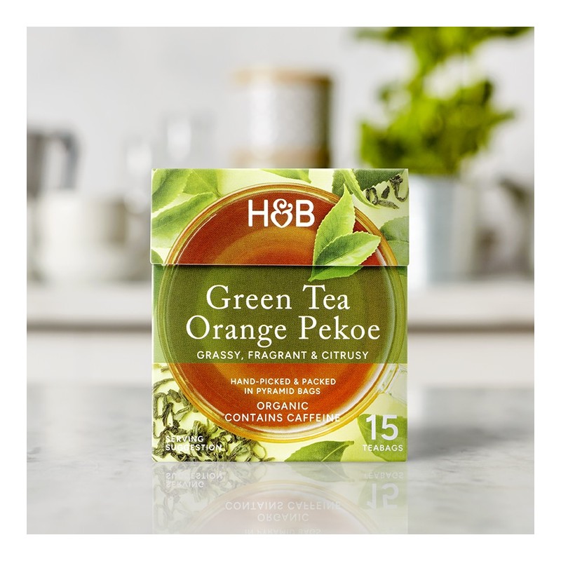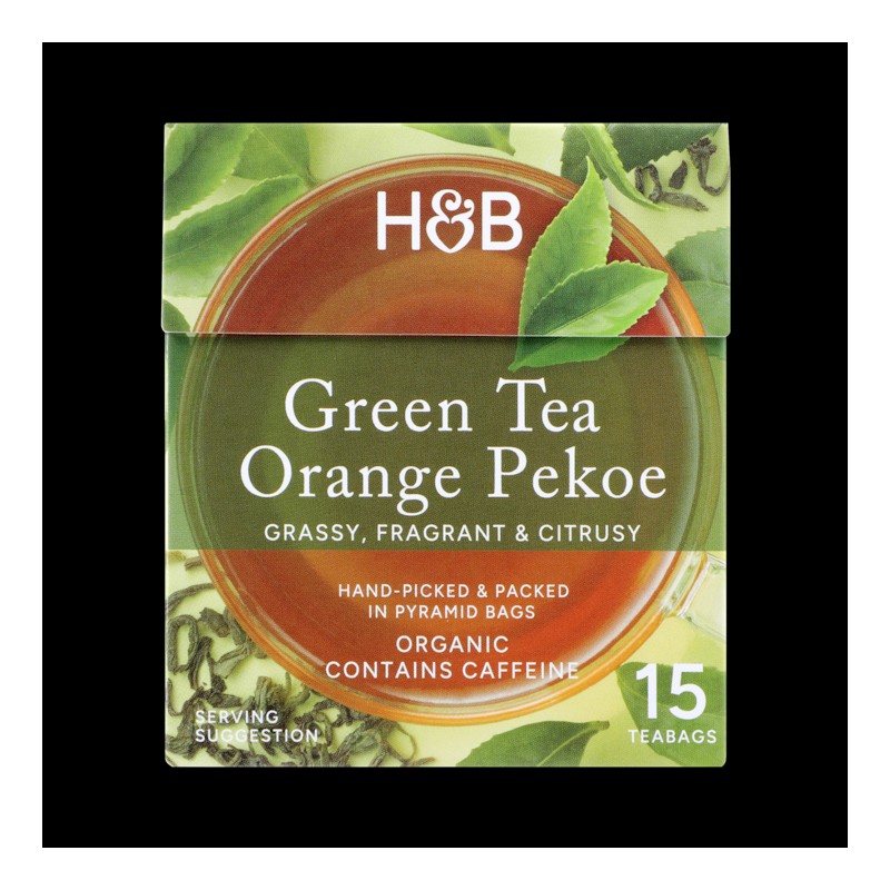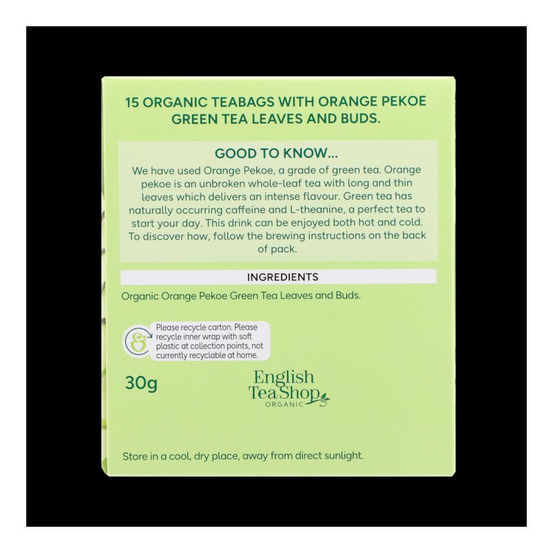 Feel energised with our Orange Pekoe green tea, sourced in partnership with the B Corp-certified English Tea Shop. This organic Sri Lankan tea has naturally occurring caffeine, making it perfect to start the day with. A mild citrus sweetness is expertly blended with the grassy and botanical notes that are typical of green tea, creating a perfectly balanced flavour. Can be enjoyed hot or cold.