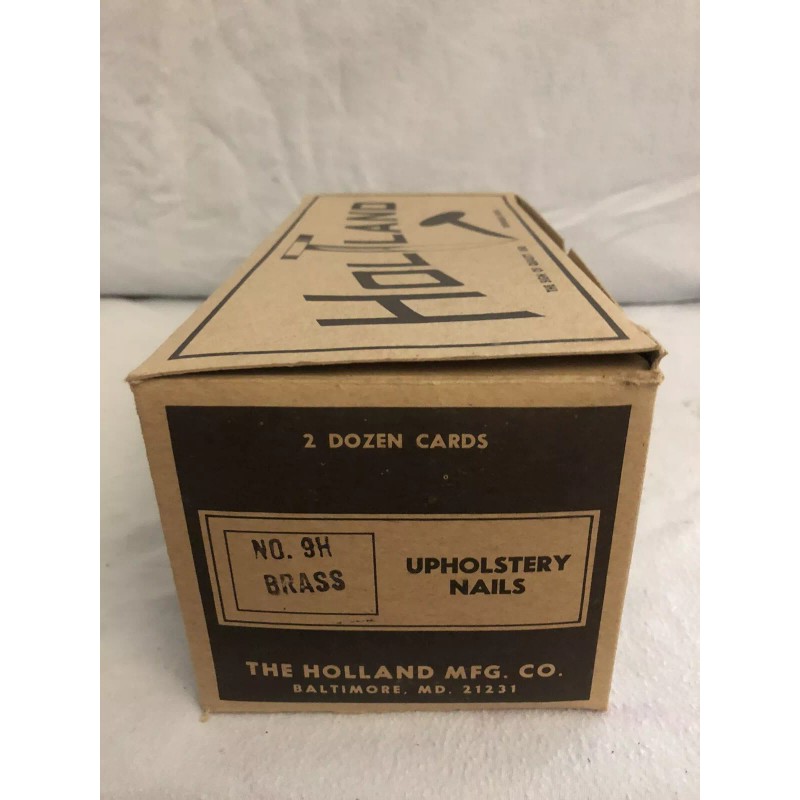 NOS Holland 9H Hammered Brass Upholstery Nails Tacks 24 Packs X 24 = 576/Box. Each tack measures 7/16” diameter head and slightly over 1/2” usable length shank. Condition is "New". Shipped with USPS Parcel Select Ground. If you would like lesser quantities drop me a message. 8 boxes available at listing.