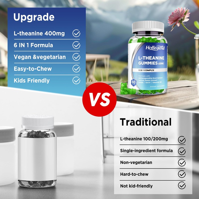 HOLLEGEND HOLLEGEND L-Theanine Gummies, l'theanine 400mg with Ashwagandha, GABA, 5HTP,L-Theanine Chewable Supplement for Relax, Zzz & Focus Support, Vegan, Lemon Flavor, 60 Counts