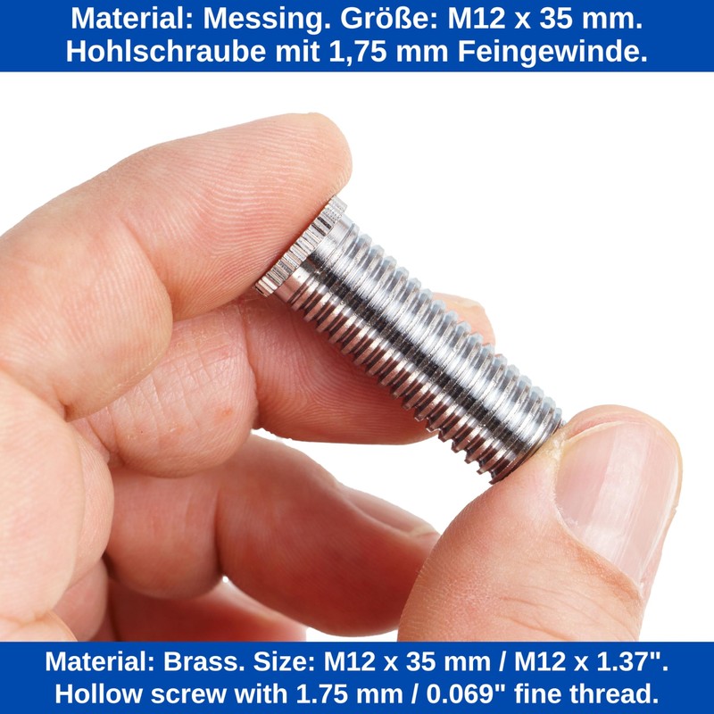 Hollow screw for strainer basket valves, M12 x 1.75 x 35 mm, 1 piece, made of brass, with fine thread, for sink valve drains with 1.5 to 3.5 inches, drain valve screw sink, drain set accessories.