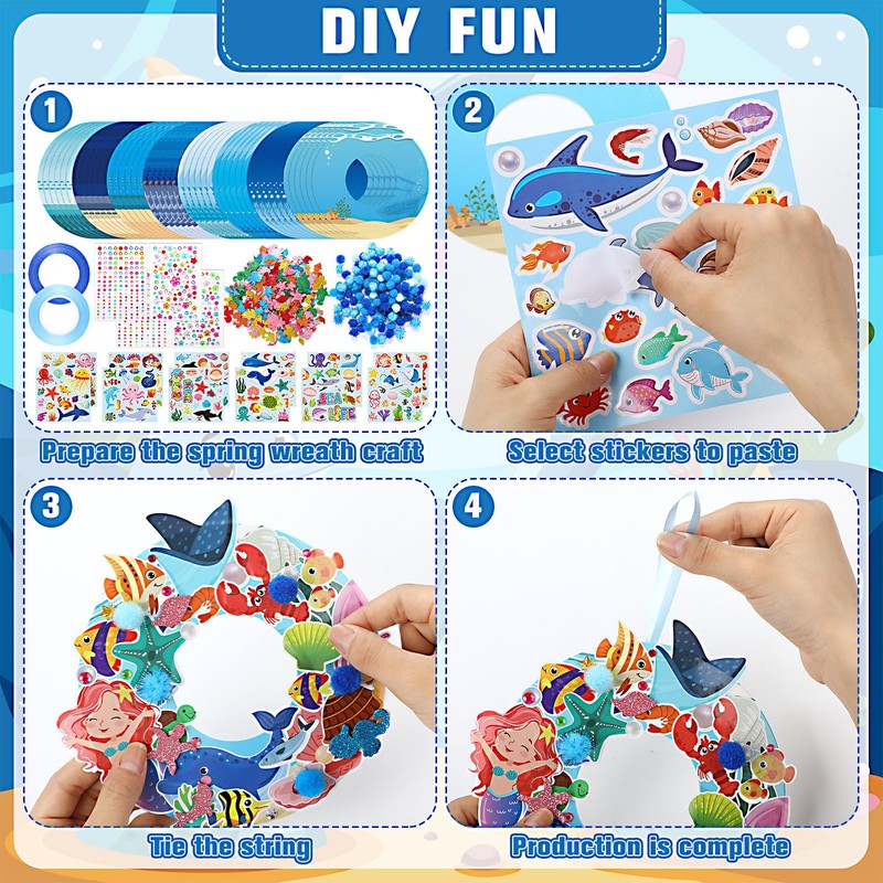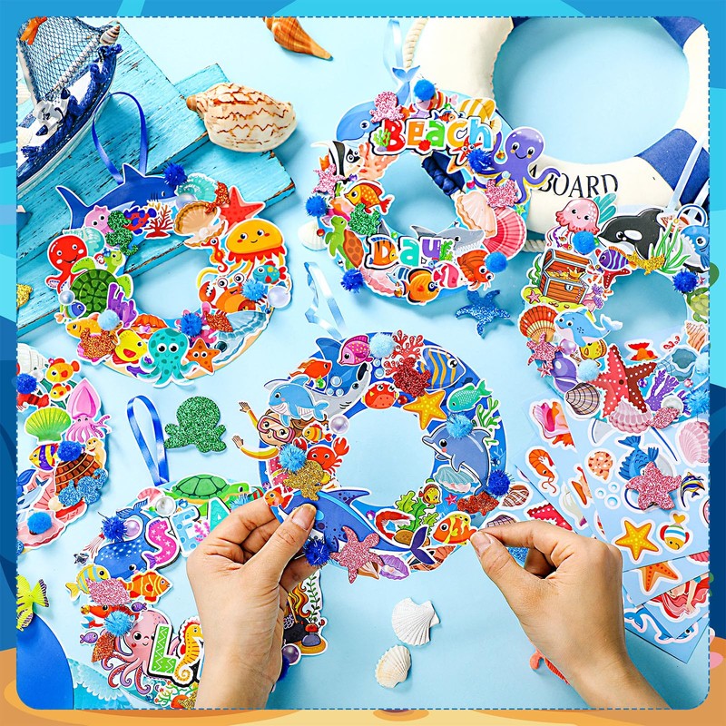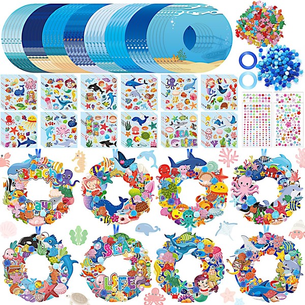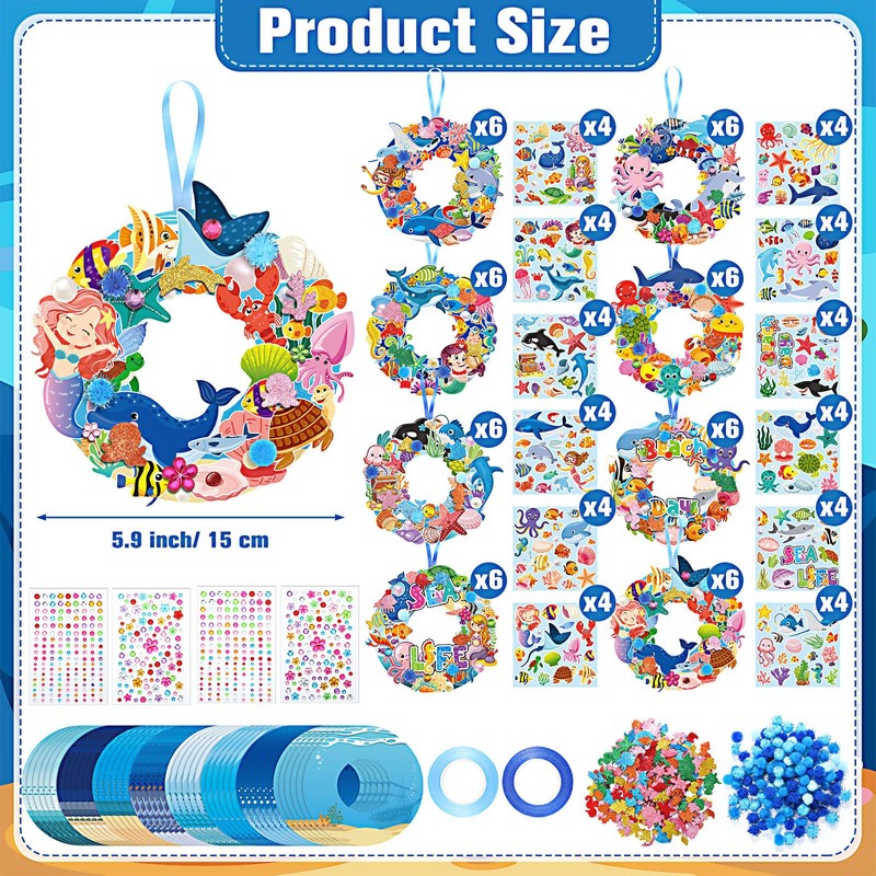 - Marine Animal Craft Kit: you will receive 48 sets of ocean wreath craft, 6 styles, 8 pieces each, including 48 marine animal theme stickers (6 styles, 8 pieces each), 1 pack of 300 foam ocean stickers, 4 diamond stickers, 4 rolls blue ropes, suitable for multiple people to carry out ocean DIY wreath activities