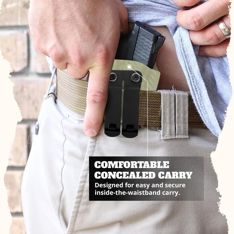 - Custom Belt Attachments: This holster offers great flexibility with various belt attachment options. Whether you prefer clips or loops, it works with many attachments, including Fold Over FOMI Clips, DCC MonoBlock, DIY Quick Clips, FabriClips, Soft Belt Loops, and UltiClips. This wide range of compatibility allows you to set up your holster in the way that feels most comfortable and secure for you, no matter how you like to carry it.