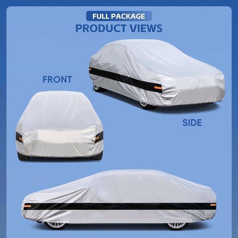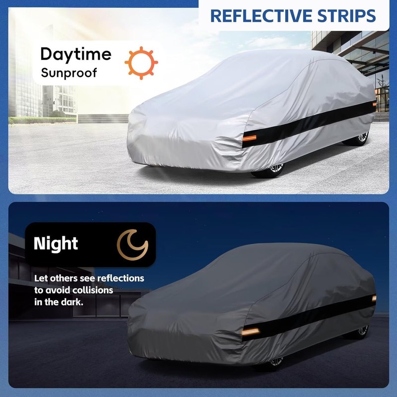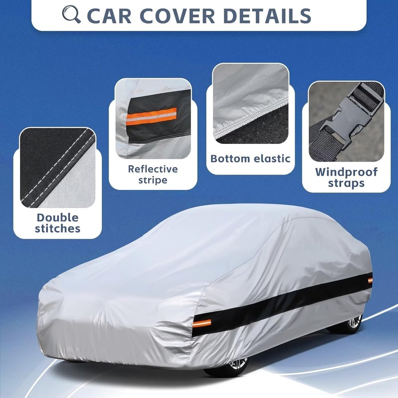 - 〖Product Details〗 -1:Holthly car cover has three pairs of windproof belts, each of which is reinforced so that it won't blow away even in high wind weather. 2:We provide a big bag that can readily fold the cover in the trunk for transport. 3: We use double stitches to sew the edge, which can make the edge of the car cover more firm and not easy to get off the line. 4:The Car Cover has 4 reflective strips to remind people not to hit cars at night.