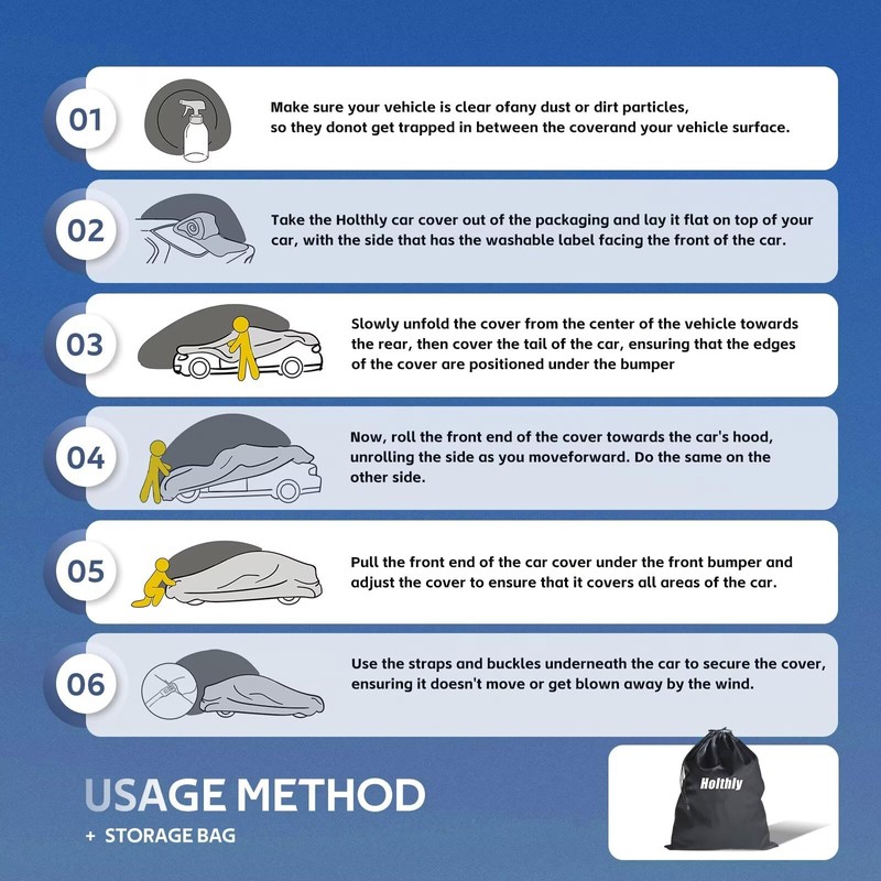 - 〖Product Details〗 -1:Holthly car cover has three pairs of windproof belts, each of which is reinforced so that it won't blow away even in high wind weather. 2:We provide a big bag that can readily fold the cover in the trunk for transport. 3: We use double stitches to sew the edge, which can make the edge of the car cover more firm and not easy to get off the line. 4:The Car Cover has 6 reflective strips to remind people not to hit cars at night.