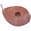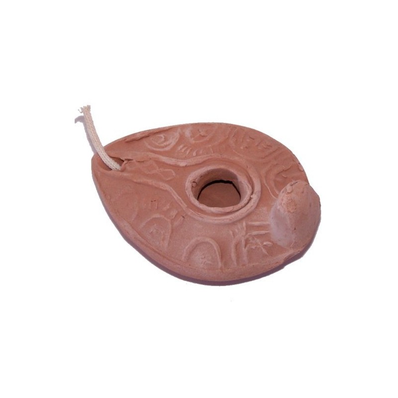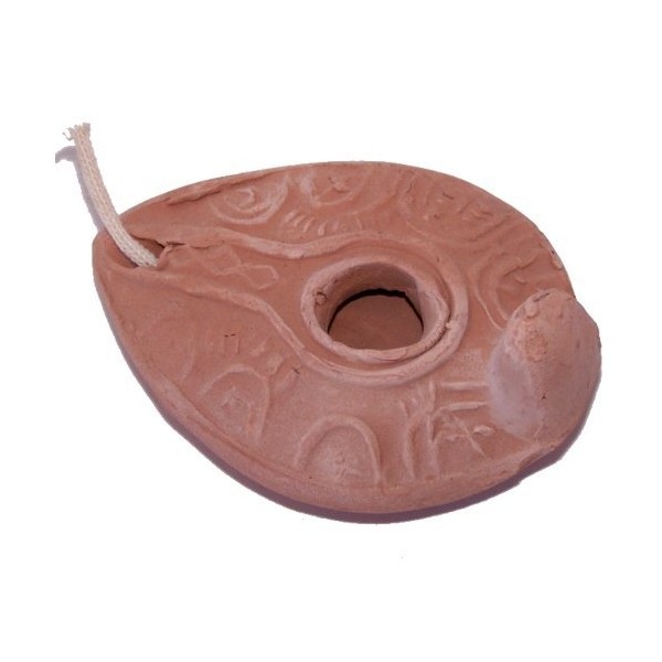 palm sized lamp is a replica of the lamps used at the time King Herod. These lamps were made from clay that was baked, terra cotta. The Herodian lamp dates from about 50BC through the time of Christ. It is wheel made with the spout added later. Olive oil is the preferred fuel for burning. This very well could have been the style of lamp in Mary and Joseph's house and also the lamp type that was used in the Upper Room.