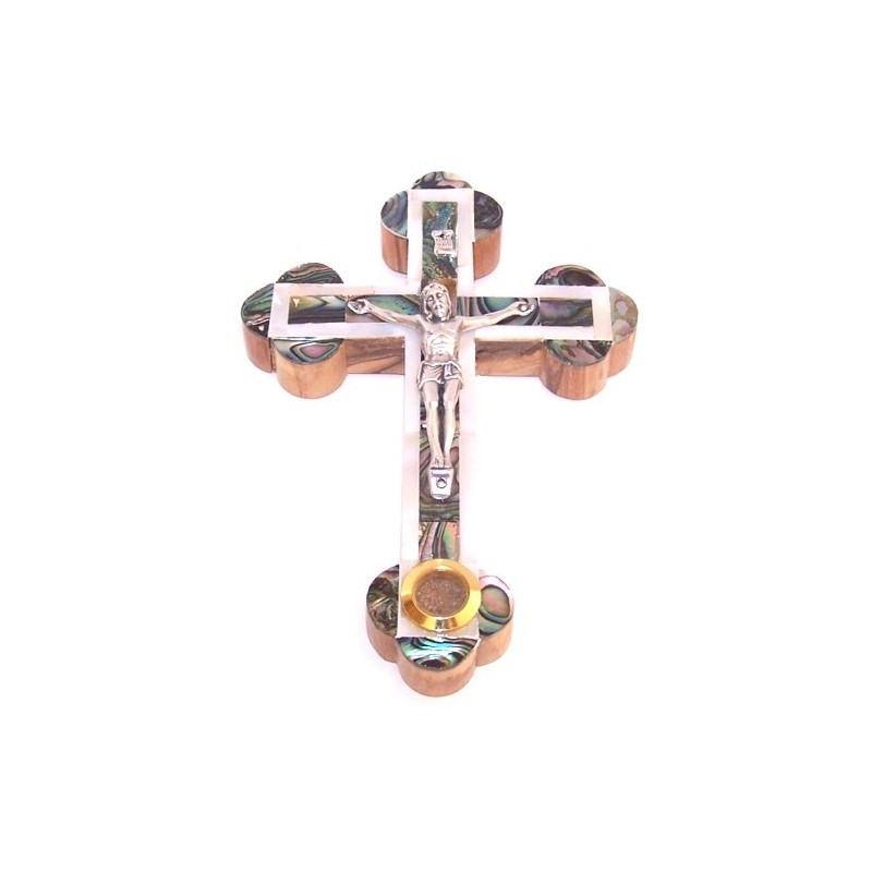 - Top quality olive wood Cross, hand made in Bethlehem, the Holy Land. Comes with Mother of Pearls layer as shown on top. Comes with Soil Sample from the Holy Land, the Land of our Lord Jesus.