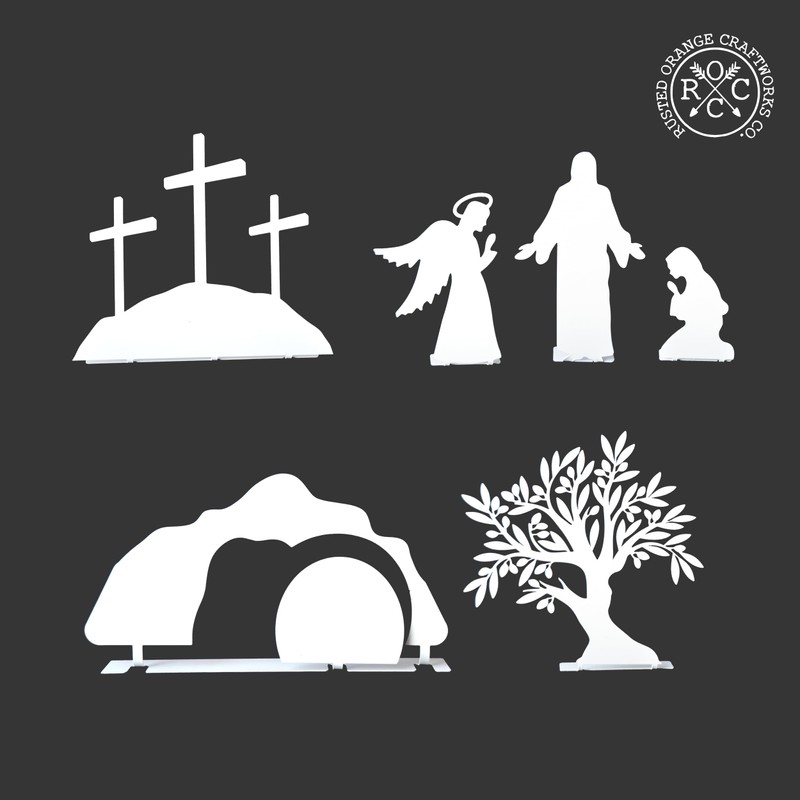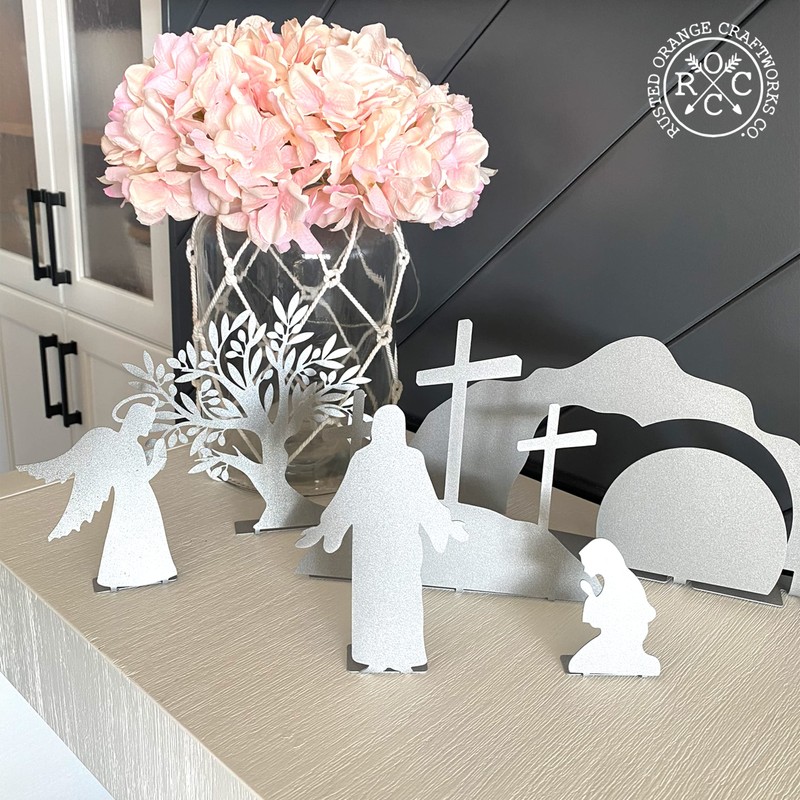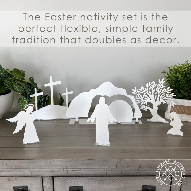 The Easter nativity set is the perfect flexible, simple family tradition that doubles as decor. This modern nativity set includes a tomb, tree, cross, redeemed Jesus, angel, and Mary, making it a beautiful religious Easter decor for your home. The set also includes cards with scriptures, questions to ponder, video links, and prompts to use during the holiday season, making it a great way to turn setting up this nativity scene into a cherished family tradition. The product is made from durable steel and can be powder coated in black, white, or silver for a long-lasting finish, or left raw and unsealed for a more natural look. The bendable tab allows the set to stand up on its own, making it the perfect Easter display. This Easter Nativity Set is more than just a decoration; it is a way to bring the story of Jesus' resurrection to life in your home. Each piece in the set has been carefully crafted to tell the story of the Easter holiday, from the tomb to the redeemed Jesus. Whether you choose to place it on your mantel, on a table, or in a special display, this nativity set is sure to become a cherished part of your holiday traditions. The set comes with a variety of resources to help you make the most of your Easter nativity scene. Whether you choose to set it up each year, or to use it as a special way to commemorate Resurrection Day, this Easter Nativity Set is a beautiful and meaningful way to remember and celebrate the Easter holiday. The Easter Nativity Set is a versatile addition to your Easter decorations. Whether you're looking for a way to celebrate the holiday with your family, to add a touch of faith to your holiday decor, or to simply enjoy the story of Jesus' resurrection in a new and meaningful way, this nativity set is the perfect choice. Dimensions: tomb - 5.6" tall x 12" wide | tree - 6.6" tall x 7" wide |cross - 7" tall x 8" wide Jesus - 6" tall x 3.7" wide | angel - 4.75" tall x 3.4" wide |Mary - 3" tall x 2" wide
