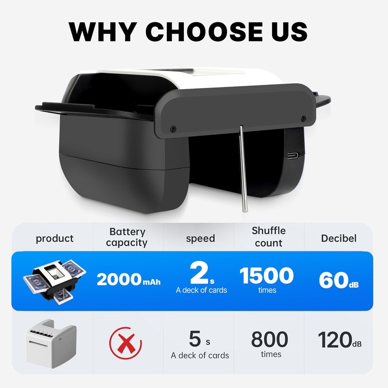 - Low Noise Shuffling: This card shuffler machine operates at just 65dB, reduce by 50% quieter than a laugh. Low noise provide a more enjoyable game experience and no worries about disturbing others.