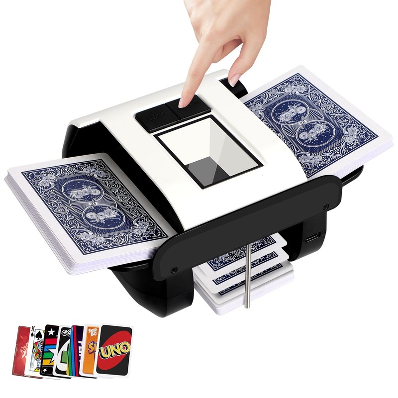 - For Various Cards: With innovative retractable wing design, the electric card shuffler is great for Poker, UNO, Blackjack, Mahjong, Skip-Bo, Phase 10, Five Crowns, etc. The Poker shuffler can handle 1-2 decks at a time.