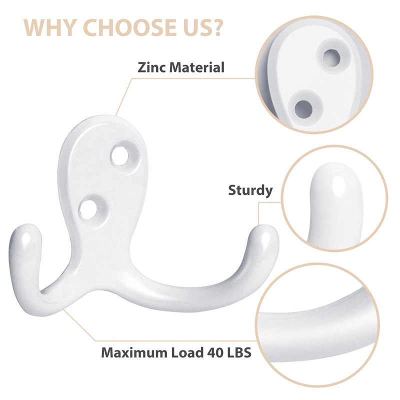 - Homanu 24 Pack Coat Hooks, Heavy Duty Double Prong Coat Hooks Wall Mounted with 48 Screws, No Rust White Metal Wall Hooks for Hanging Towel, Coat, Bag, Hat, Cup, Key