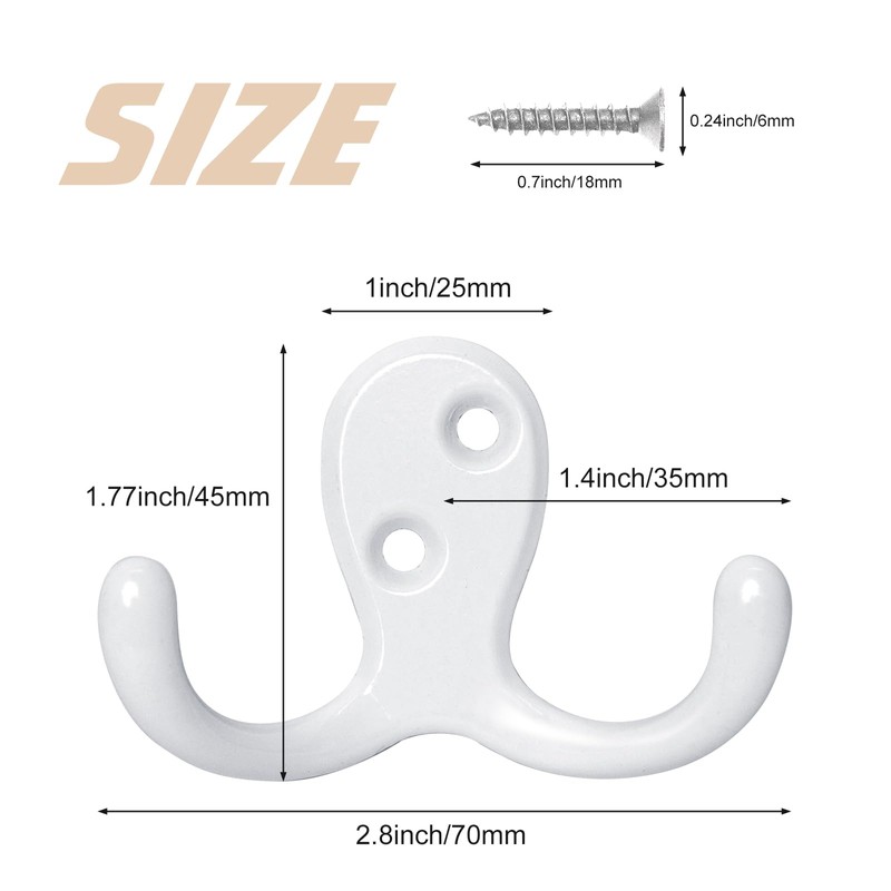 - 【Super Cost-effective Set】34 x White coat hooks, 68 x screws. double hooks design makes coat hooks beautiful, rustic, suitable for most decoration. Coat hooks can help you organize clutter quickly, meet your different hanging needs.