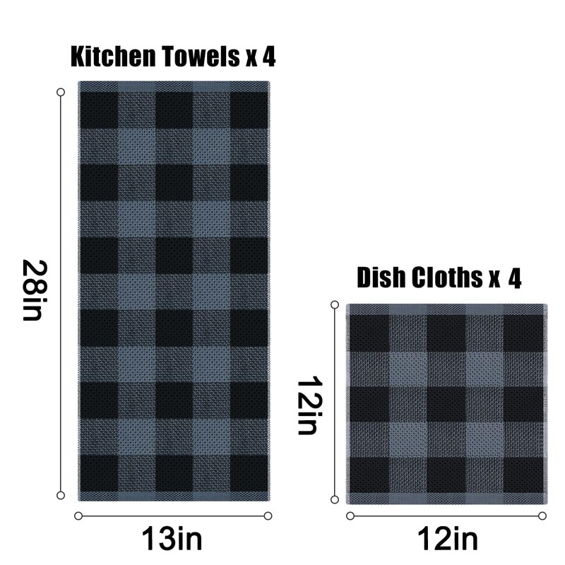 Homaxy Kitchen Towels and Dishcloths Set, 12 x 12 and 13 x 28 Inches, Set of 8 Bulk Cotton Waffle Weave Check Plaid Kitchen Towels, Super Soft and Absorbent Dish Towels, Black & Grey