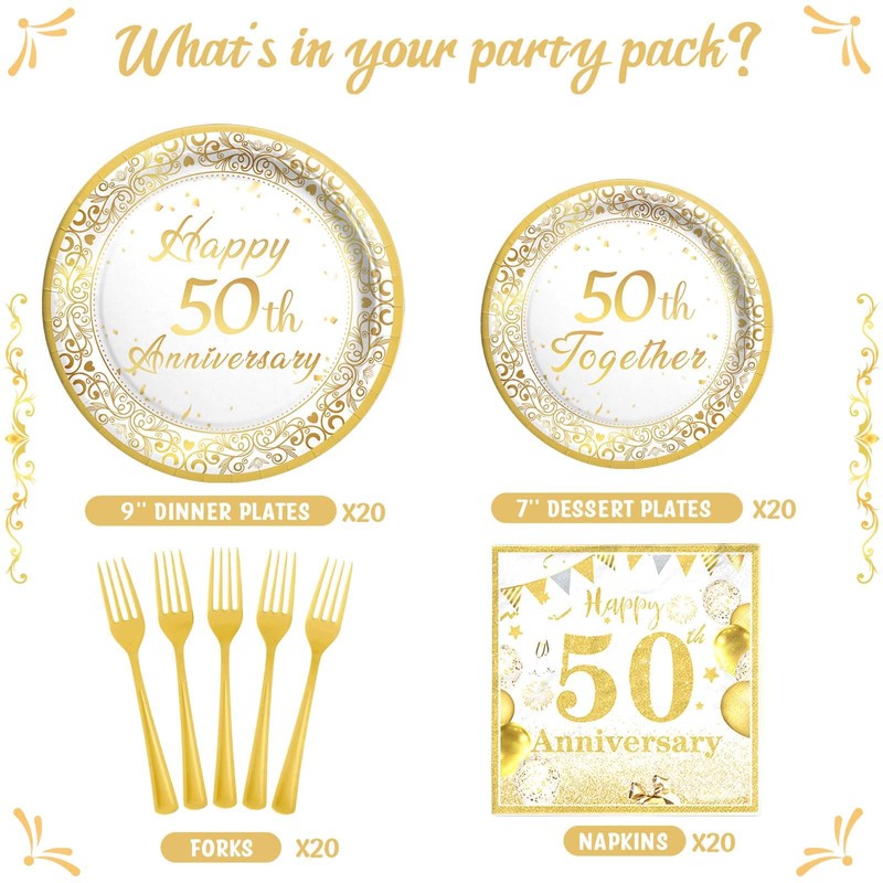 - 50th Anniversary Supplies Tableware Set Includes: The package comes with 20 x 9'' round paper dinner plates, 20 x 7'' round paper dessert plates, 20 x 4.9'' napkins, and 20 x gold forks. DO NOT put the plates in the microwave