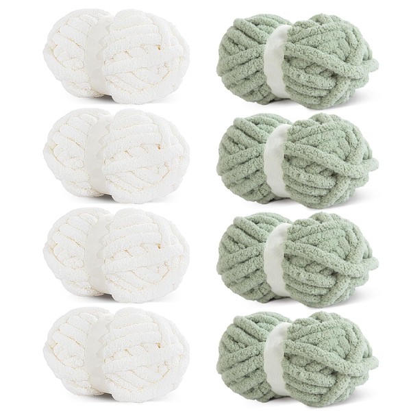 HOMBYS 8 Pack Assorted Chunky Yarn for Crocheting,Super Bulky Large Soft Fluffy Yarn,Plush Fuzzy Yarn,Thick Chenille Yarn for Hand Knitting/Arm Knitting,4 White & 4 Sage Green(27yds,8 oz Each Skein)