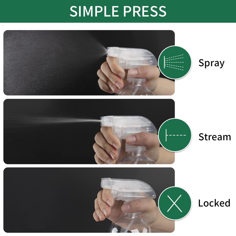 - Leakproof Design: Our sprayer tops include leak-proof gaskets to prevent liquid leaking and can avoid unnecessary waste. It can also be reversed to off mode when not in use to prevent dripping.