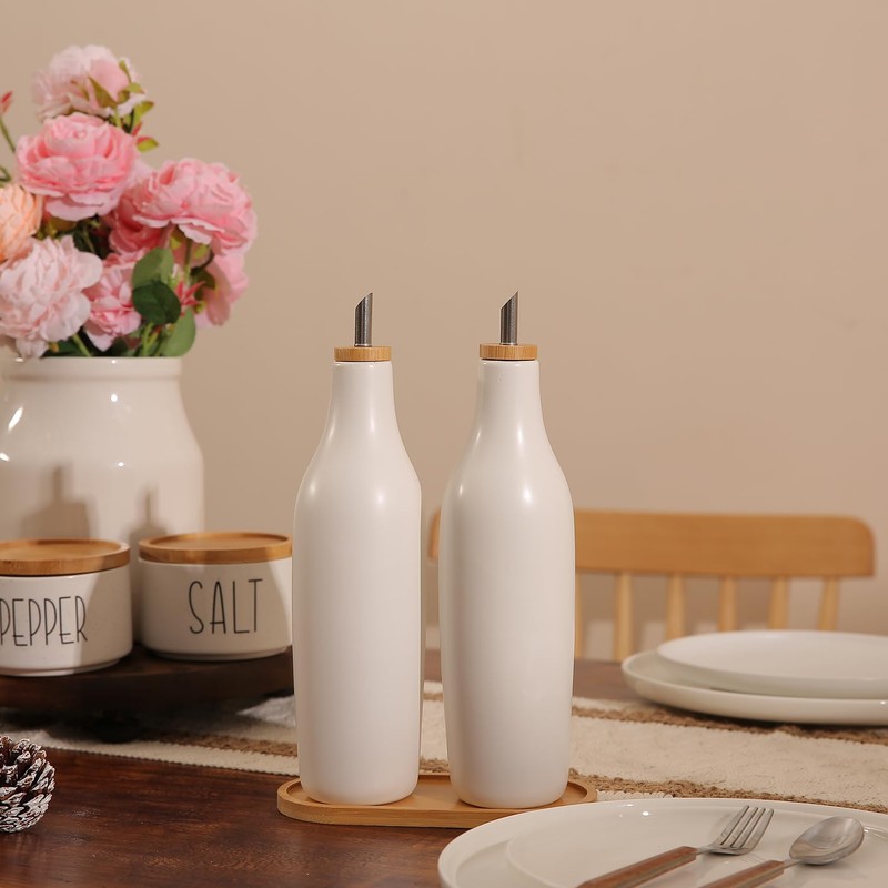 - KITCHEN BOTTLE DISPENSER - 16.9 fluid ounce (500 ml) Ceramic oil dispenser bottle or vinegar dispenser bottle with bamboo cap and stainless steel cruet spout, Works great as a kitchen dispenser for Olive Oil, Vinegar, syrups and more.