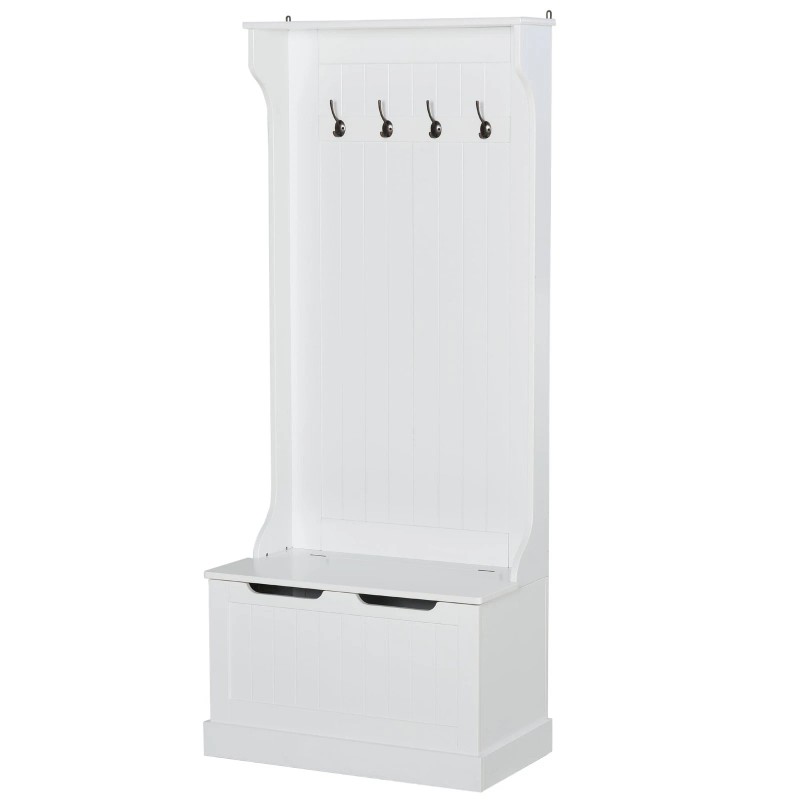 The entryway is the first place people see when they enter your home. This space often becomes a mess of clothing and other items. Keep it neat and organized with our HOMCOM hall tree, storage bench, and coat rack. It's made of durable wood, four metal hooks, and a roomy storage bench for sitting and keeping things clutter-free. The anti-toppling device keeps your family safe. Make your house a home with HOMCOM.