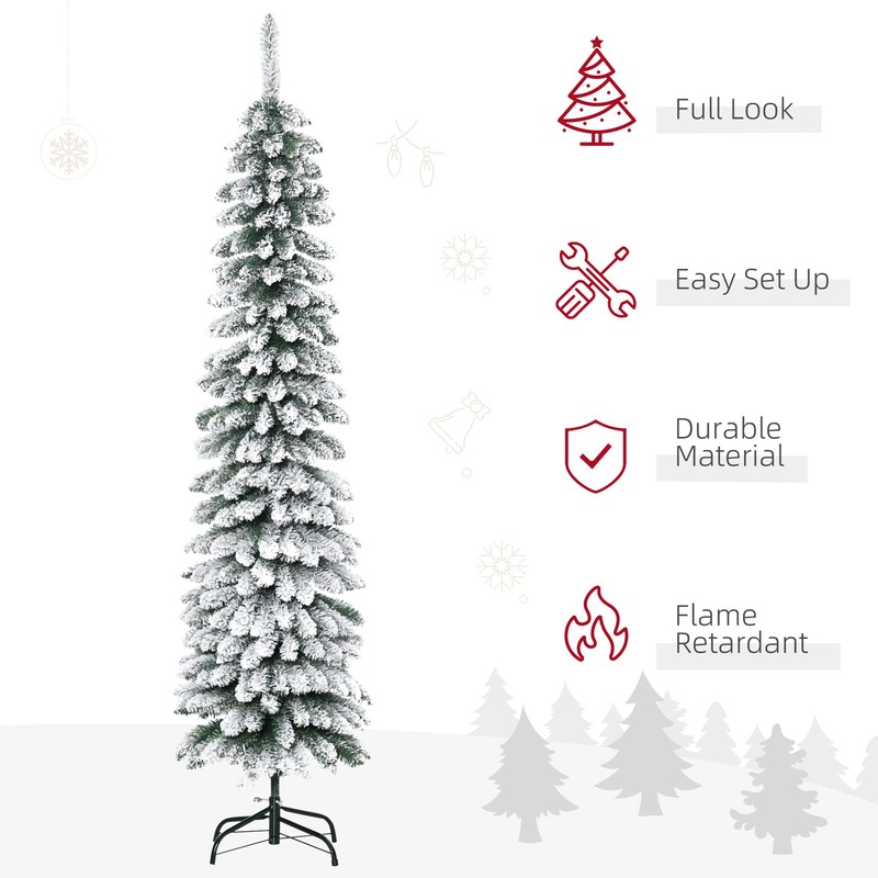 HOMCOM 6' Tall Unlit Snow Flocked Artificial Christmas Tree, Slim Pencil Xmas Tree with Realistic Branches and 395 Tips, Green