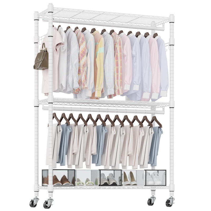 Homdox 3 Tier Heavy Duty Garment Rack with Wheels, Adjustable Wire Clothes Rack with Double Hanging Rods, Portable Closets for Hanging Clothes with Side Hooks, White