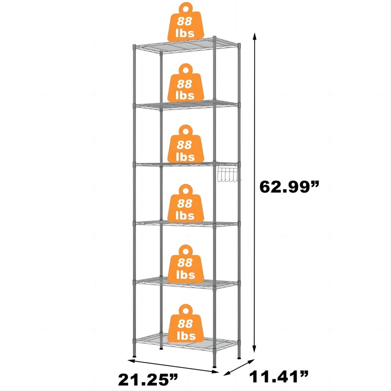 Homdox Wire Shelving Unit Storage Rack Metal Shelf Organizer with Hooks for Kitchen Bathroom Garage Balcony 6-Tier, 21" x 11.5" x 63", Gray