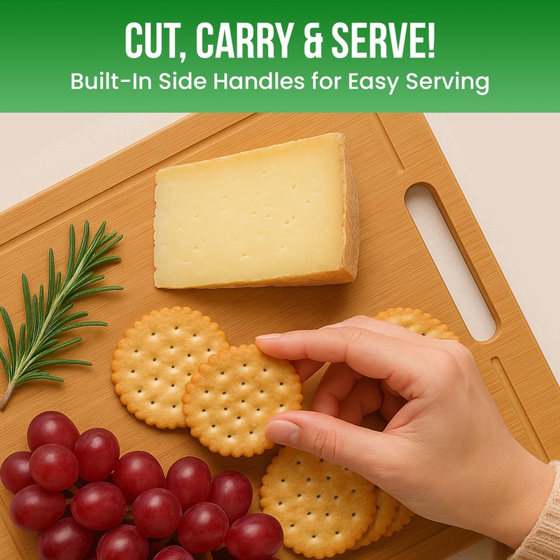 - PREMIUM CONSTRUCTION: Natural wood cutting board featuring juice grooves and built-in handle for easy carrying and convenient food preparation