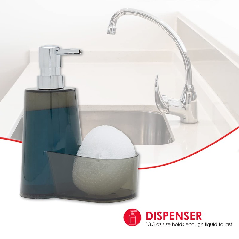 Home Basics 13.5 oz. Plastic Soap Dispenser with Sponge Compartment, Grey | Sturdy Plastic | Side Compartment for a Sponge | One Pump Gives You The Right Amount Each Time