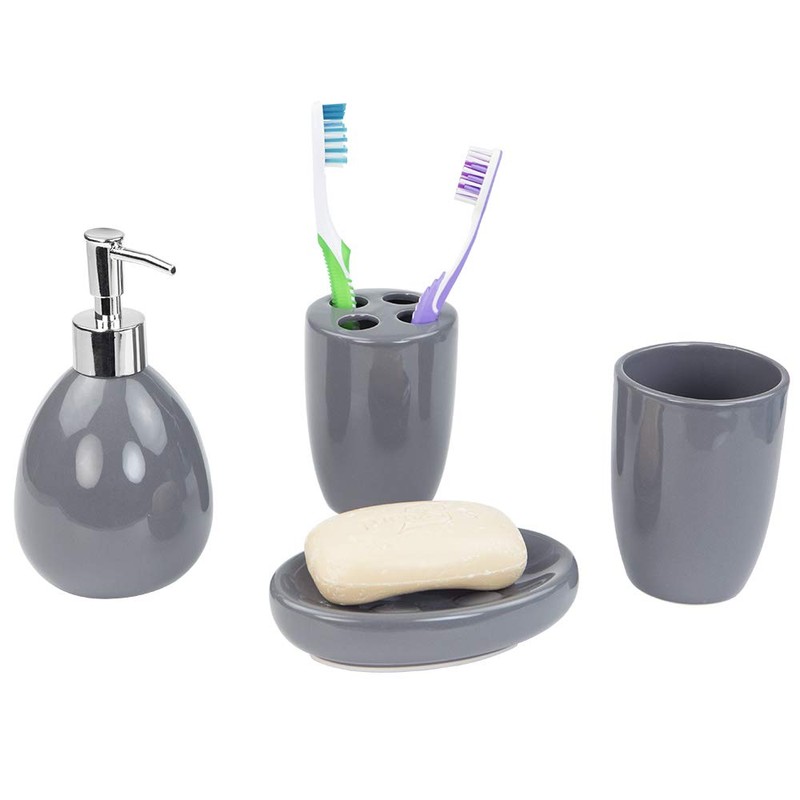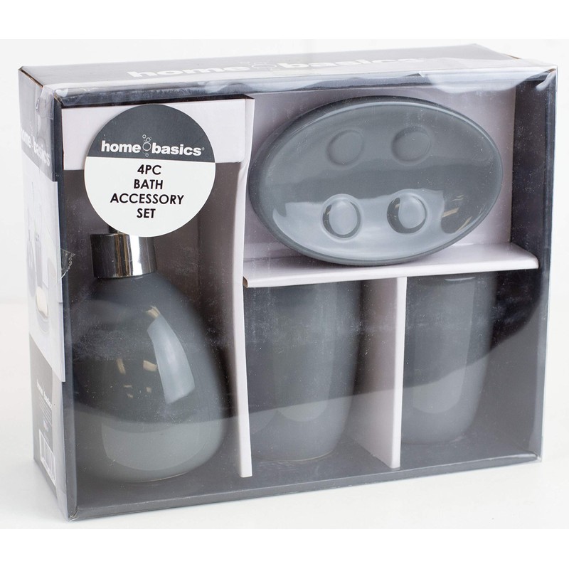 Color:Grey HOME BASICS 4PC BATH ACCESSORY SET NAVYGrace your bathroom vanities with a modern flair by displaying this four piece contemporary bath accessory set. This set includes all the essentials to get you through your routine, from the rounded lotion dispenser with durable stainless steel pump for easy dispensing, generous size tumbler for rinsing or drinking, a large soap dish to store your favorite bar of soap, and 4 slot toothbrush holder to keep your toothbrushes organized. The beautiful matte finish and a simple design coordinates perfectly with virtually any bathroom style. Whether you need to dispense your favorite silky smooth and fragant lotion or need to stylishly store away your toothbrush after cleaning that million dollar smile, this set provides the perfect blend of functionality and timeless style to your bathroom. EASY TO CLEAN: Smooth finish makes it easy to wipe down or hand wash residueCOMPLETE THE LOOK: Pair this piece with our line of vanity trays for a striking and captivating backdrop