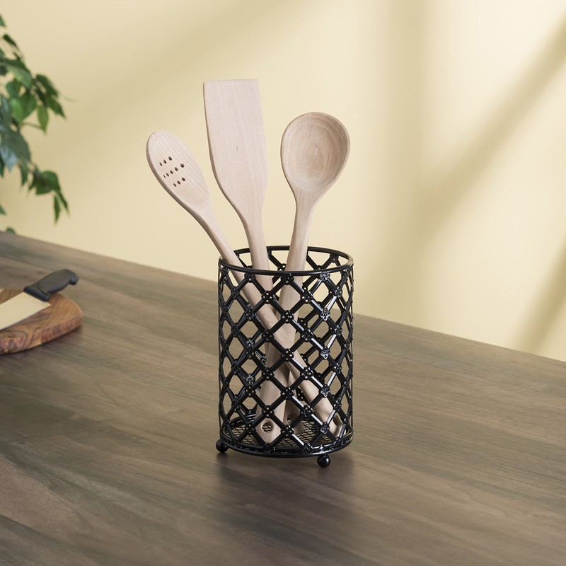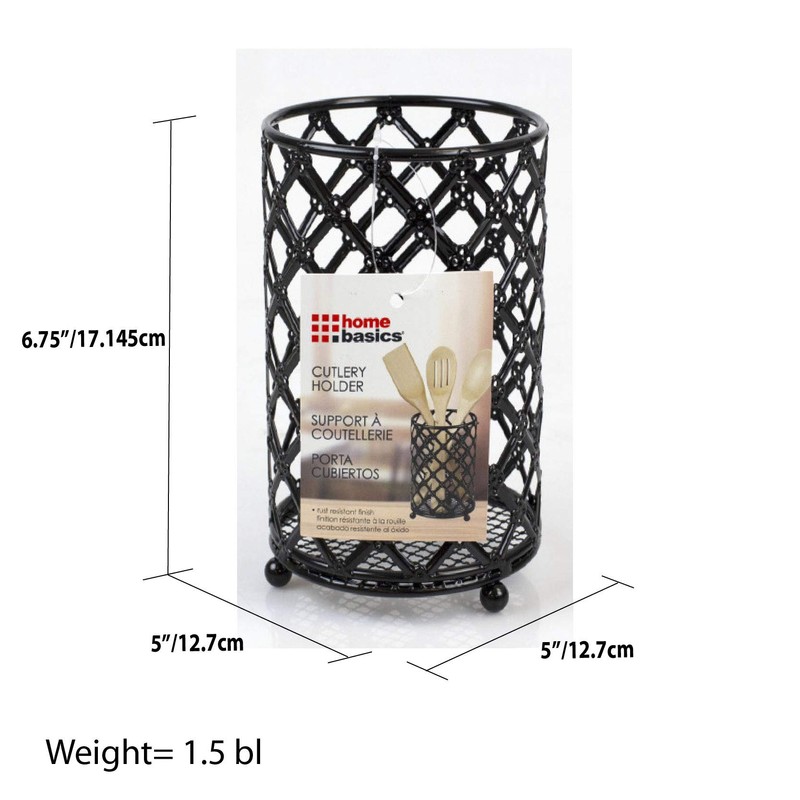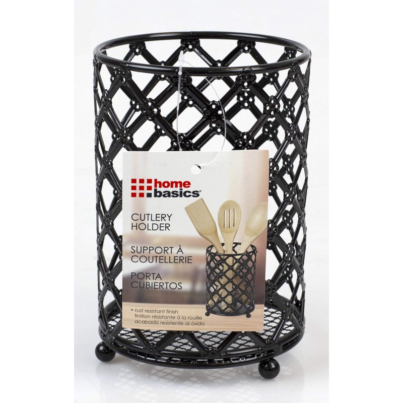 **HOME BASICS CUTLERY HOLDER LATTICE BLACK** **Keep your kitchen tools organized and neat with this cutlery holder. Made from heavy weight powder coated steel. Rust resistant. Beautiful simple lattice design is perfect for any kitchen.**