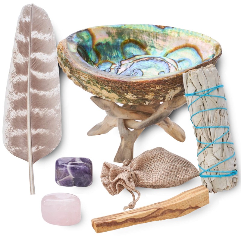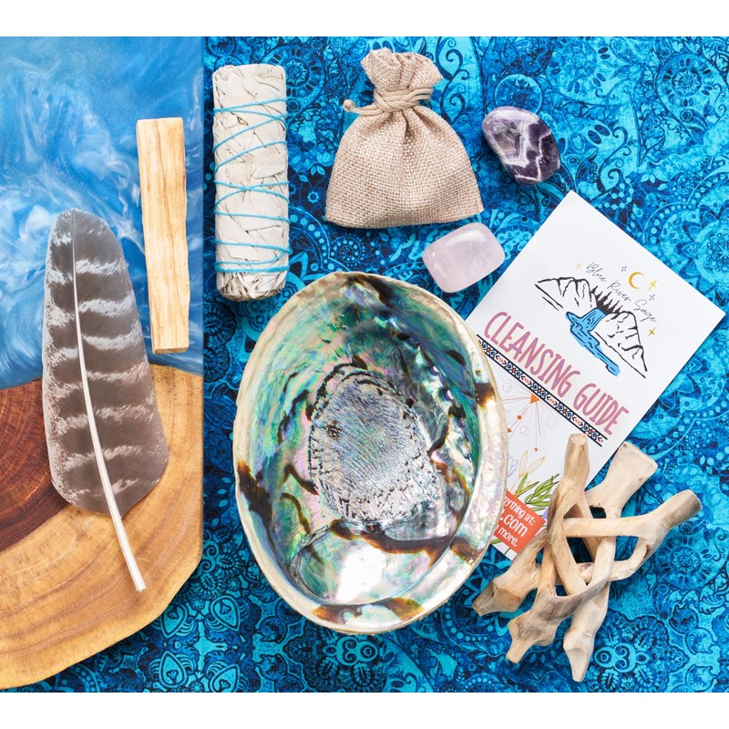 Home Cleansing & Smudging Kit with White Sage, Palo Santo, Abalone & Stand, Smudge Feather & Guide (Regular)