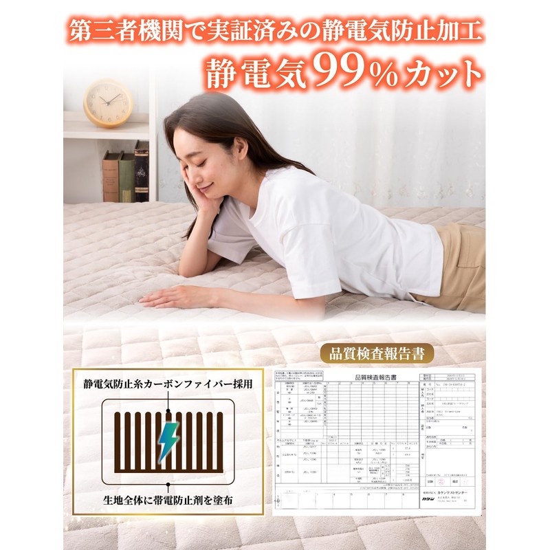 - Blocks 99% of static electricity. The warm pad uses low-static microfiber. In addition, it has undergone antistatic treatment and has been made to reduce the generation of static by 99%. It does not have the unpleasant feeling of ordinary bed pads, so it warms up comfortably