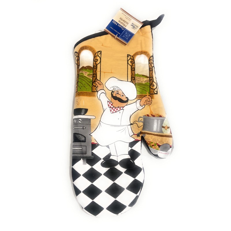 - Each mitt is 13x7-in. and pairs nicely with any style of decor as well as with our other lines of themed kitchen linens. Perfect for homes, restaurants, cafes, banquet halls, soup kitchens, and more. Get a functional, fun, and fashionable addition to your kitchen decor with Italian Chef Printed Oven Mitts!